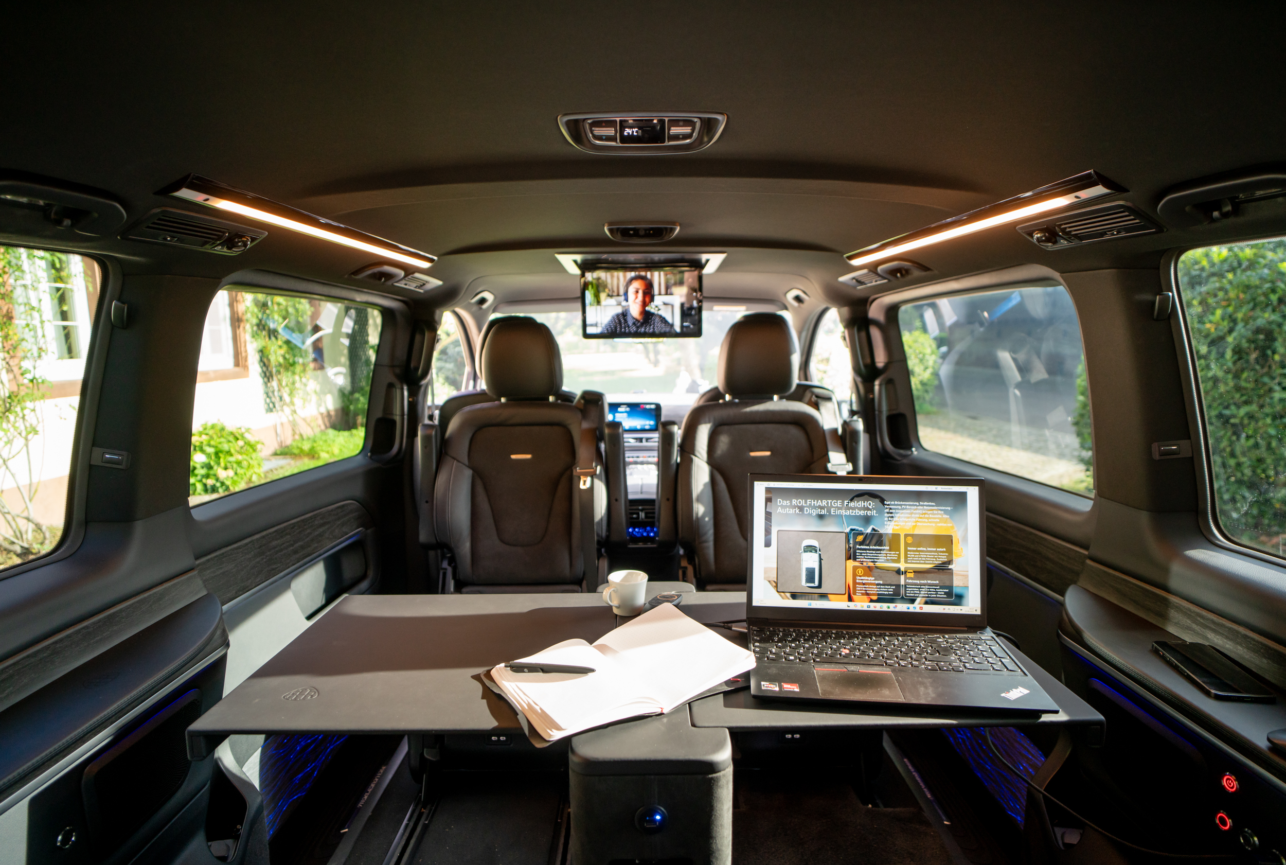 Das mobile Büro von ROLFHARTGE bietet die Smart-Working-Lösung für viele Herausforderungen, die aktuell in Unternehmen brennen, wenn Außentermine, Geschäftsreisen allein oder im Team und längere Wege zum Zielort erforderlich sind. Statt wertvolle Reisezeit zu verlieren, wird mit dem Office Van neue, produktive Zeit generiert, was langfristig zu beträchtlichen Kosteneinsparungen und einem entscheidenden Wettbewerbsvorteil führen kann. So zum Beispiel mit der Videokonferenz während der Fahrt, dank integriertem Konferenzsystem und eigens entwickelten Tisch für bis zu 4 Personen, klappbaren Monitoren und stabiler Internetverbindung.