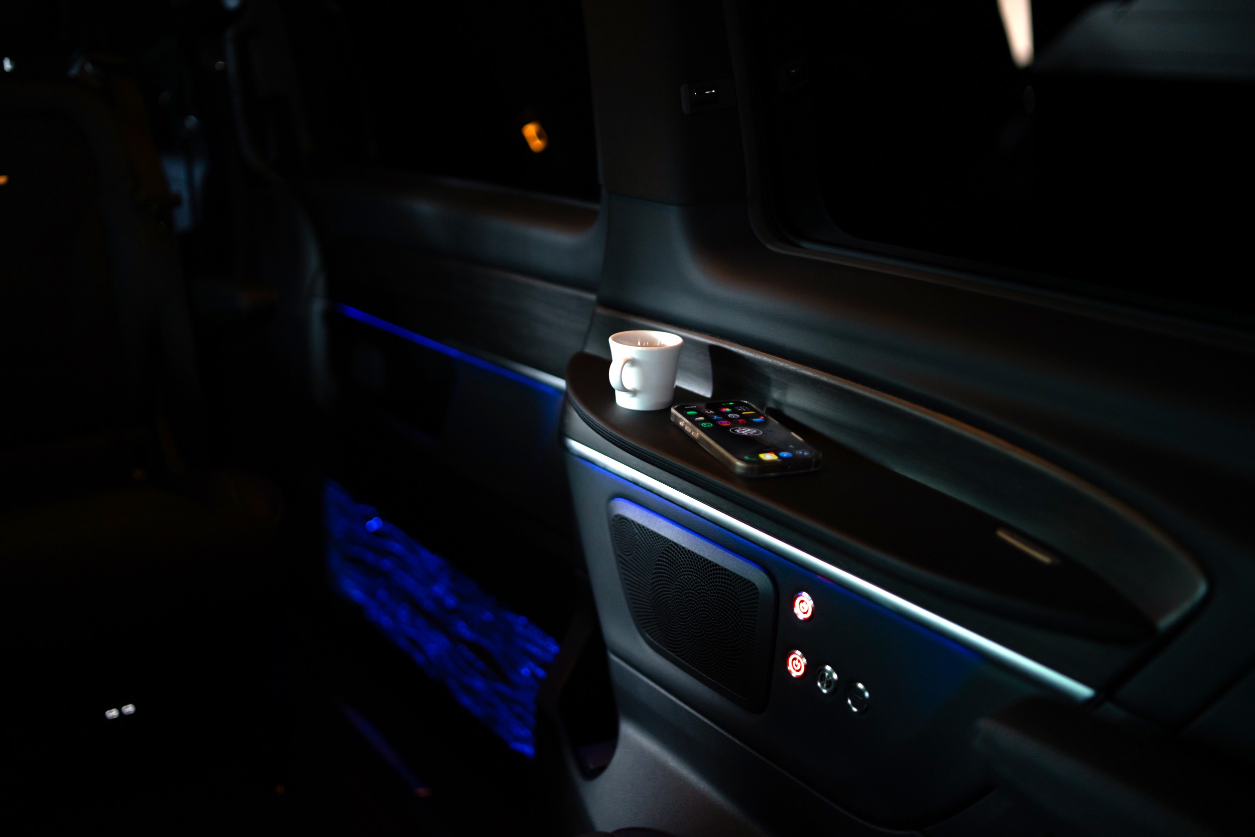 Während über die zusätzlich eingebauten Lautsprecher sowohl Entspannungsmusik als auch konzentrations- und kreativitätsfördernde Klänge gespielt werden können, sorgt die zusätzliche Geräuschdämmung der Karosserie rundherum für eine Ruhezone im Fahrzeug. Durch eine herausnehmbare Trennwand zum Fahrerraum wird eine Privatsphäre und Vertraulichkeit geschaffen, die einen entspannenden Rückzugsort entstehen lässt. Zwei justierbare LED-Arbeitsleuchten liefern jeweils bis zu 500 Lux auf die Arbeitsfläche, während über 1.000 illuminierte Glasfaserlichtpunkte auf Wunsch am Dachhimmel eine entspannende Wohlfühlatmosphäre entstehen lassen. Und auch auf die klassische Kaffeepause muss im Office Van niemand verzichten, so sind ein Kaffee- sowie Teezubereiter und ein Kühlschrank ebenfalls in der V-Klasse integrierbar.